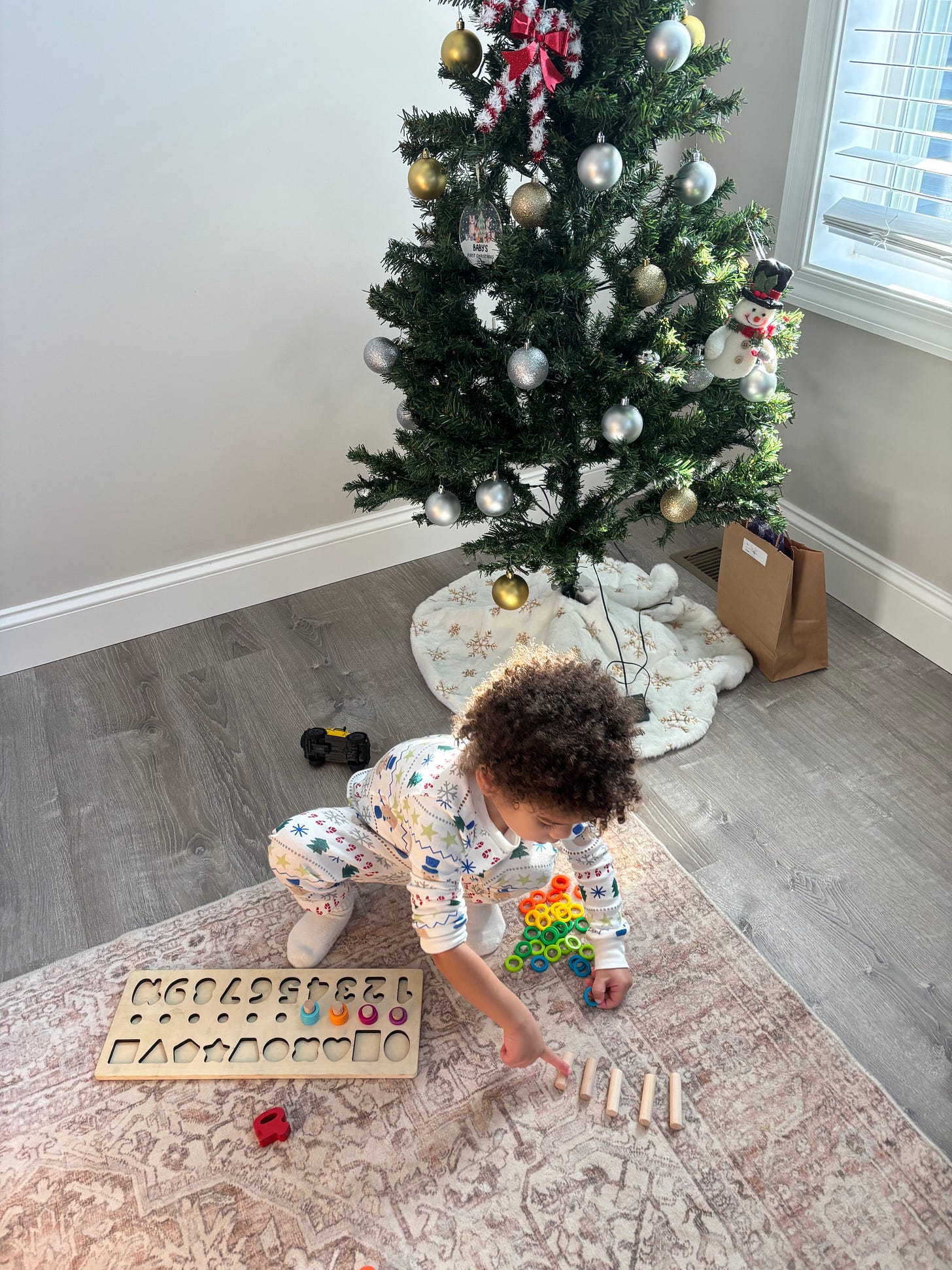 Before the day fully took off, there was a small but meaningful win. I was rushing to get out the door when Sage asked to listen to Caitie singing “Deck the Halls” one more time. So we did. He went pee before we left, we got packed up, and we were on our way to school. Five minutes into the drive he said, very clearly, that he had to go pee again. I paused, asked if he was sure, and he insisted. I pulled over, set up the trunk potty, and sure enough, he went right away. I felt so proud of him in that moment. Watching him recognize and communicate what his body needs feels like a mini miracle.